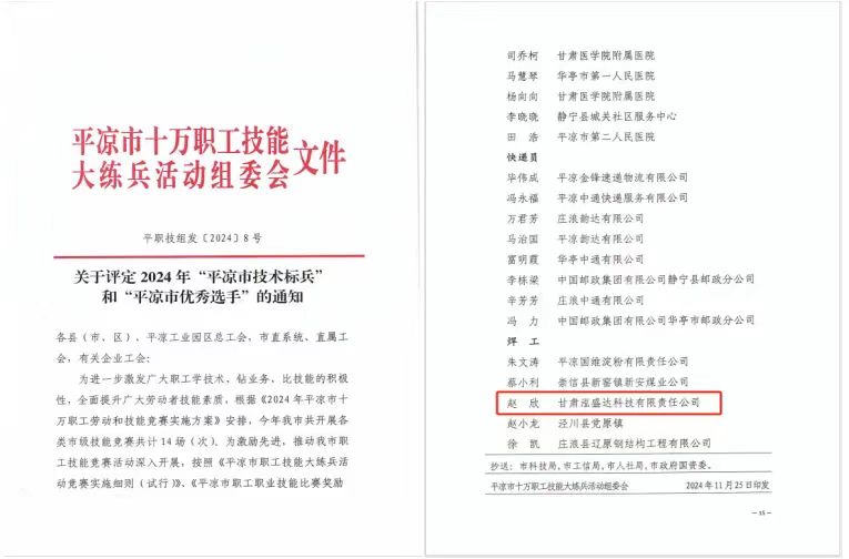 2024-11-26近日,平凉市十万职工技能大练兵活动组委会印发了关于评定2024年“平凉市技术标兵”和“平凉市优秀选手”的通知,甘肃泓盛达科技有限责任公司赵欣获得“平凉市优秀选手”称号。赵欣此次获得“平凉市优秀选手”荣誉称号,既是对他个人敬业精神的充分肯定,也是对公司