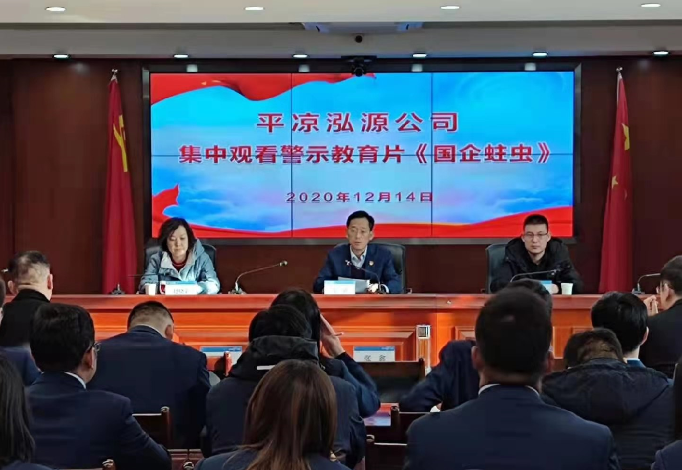 2020-12-14按照市纪委监委、市政府国资委党委安排,12月14日,泓源公司组织全体员工集中观看警示教育片《国企蛀虫》。市纪委监委第三派驻纪检监察组一级主任科员马杰、市政府国资委党建科科长赵晓荣出席指导,公司主要领导主持并讲话。会议强调,广大员工特别是领导干部、党员